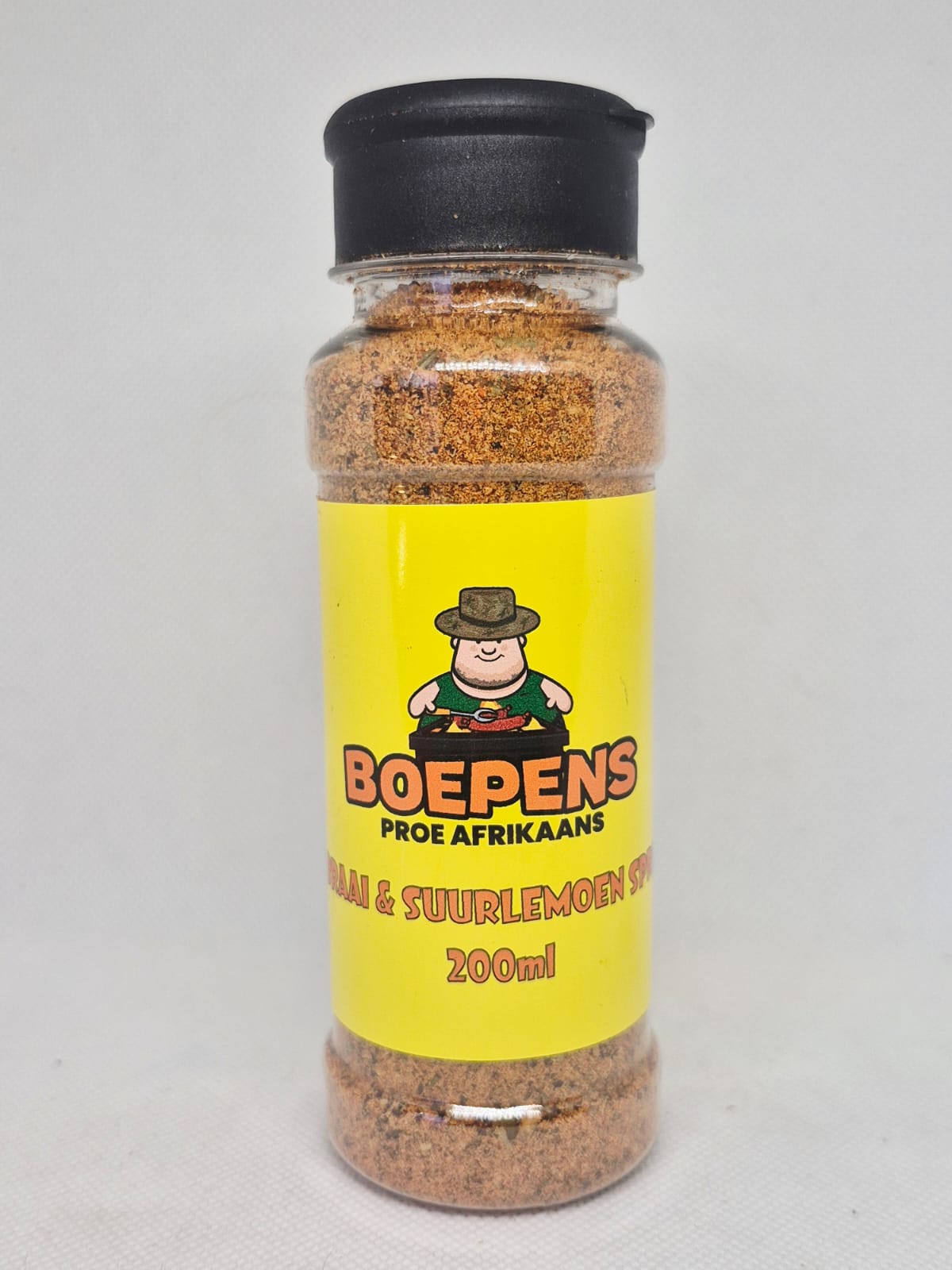 Boepens Braai en Suurlemoen Sprinkel 200ml Ingredients: Salt, Spices, Sucrose, Dextrose, Flavour Enhancer (MSG), Citric Acid, Corn Starch, Acidity Regulator